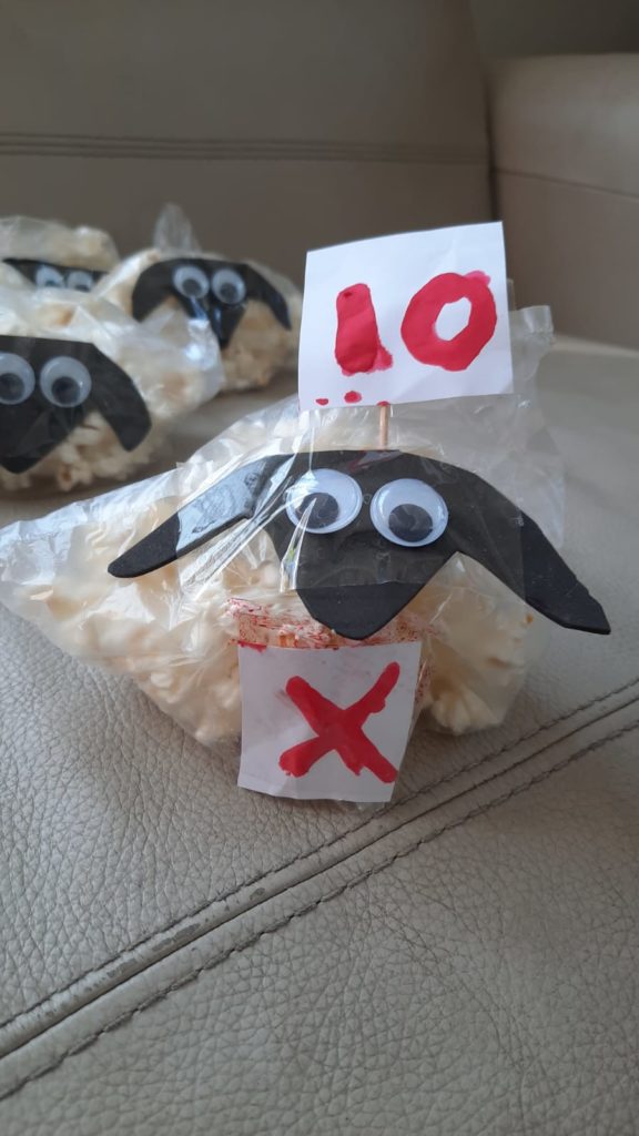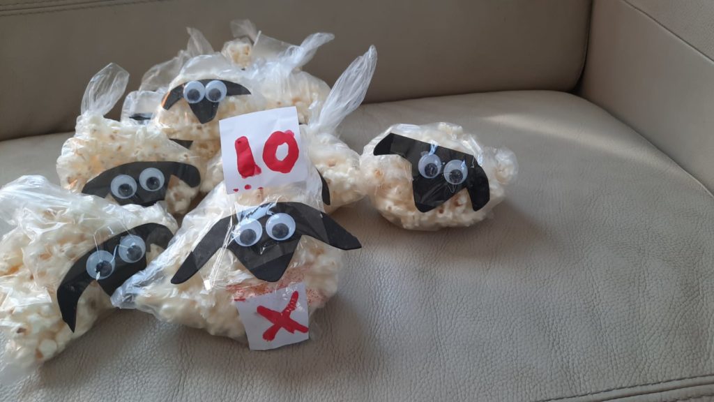 Popcorn Sheep – 10 bags, – for family members and friends and the 10th one is marked and labelled Number 10 .-Not to be given out, rather kept aside- to think about the mitzvah of Ma’asei Beheima.