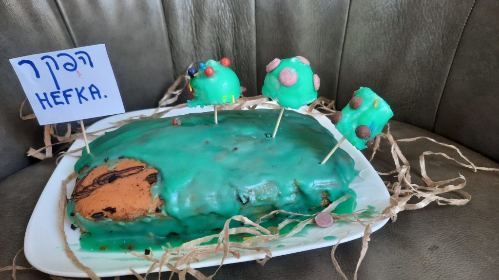 Make a ‘sign’ on a paper, attach it to a toothpick and put it on the Shmitta cake. The sign says; ‘HEFKA’ (write it in English and/or Hebrew), indicating that anybody can come to the field to help themselves to fruits during the Shmitta year.-This a great conversation piece for the Shabbat table!