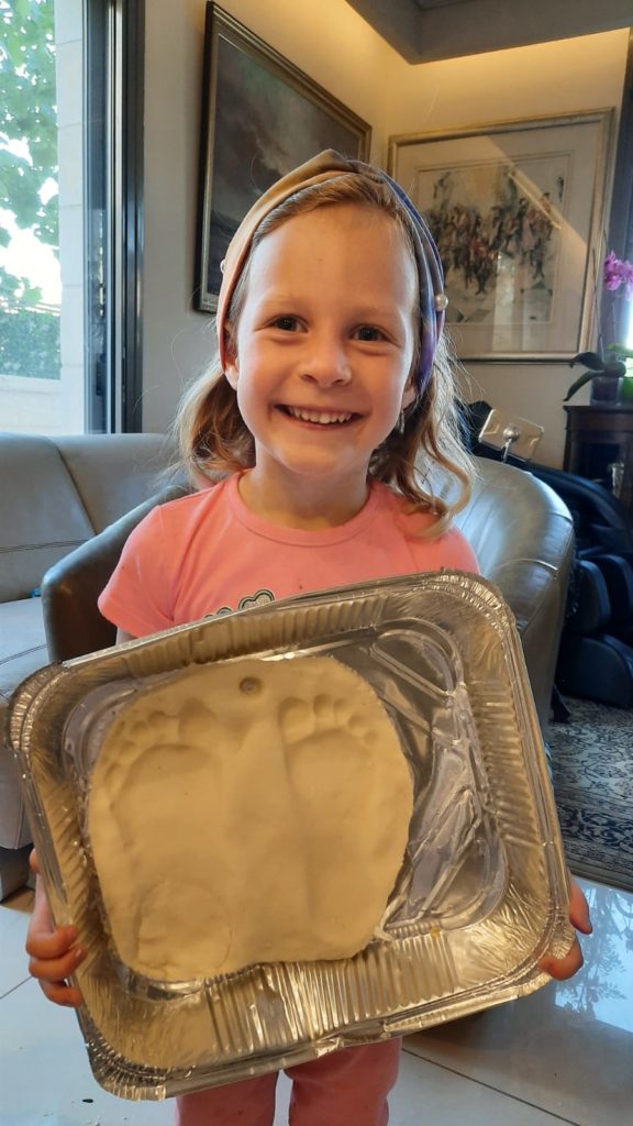 If you want to colour the salt dough, add a few drops of food coloring while you need it. Flatten out the dough, roll it, make a round or square shape. Then place your foot onto the dough to make the footprint. It’s optional to make a small hole at the top of the dough to put some string through it and hang it on the wall, once it has dried. You can bake it in a hot oven until dried out (approximately 200 F for 45 min- 1 hr) or sun dry it. And/or you can paint the footprint after it has dried.. A great reminder to ‘Walk in the way of Hashem’, run to do a mitzvah.